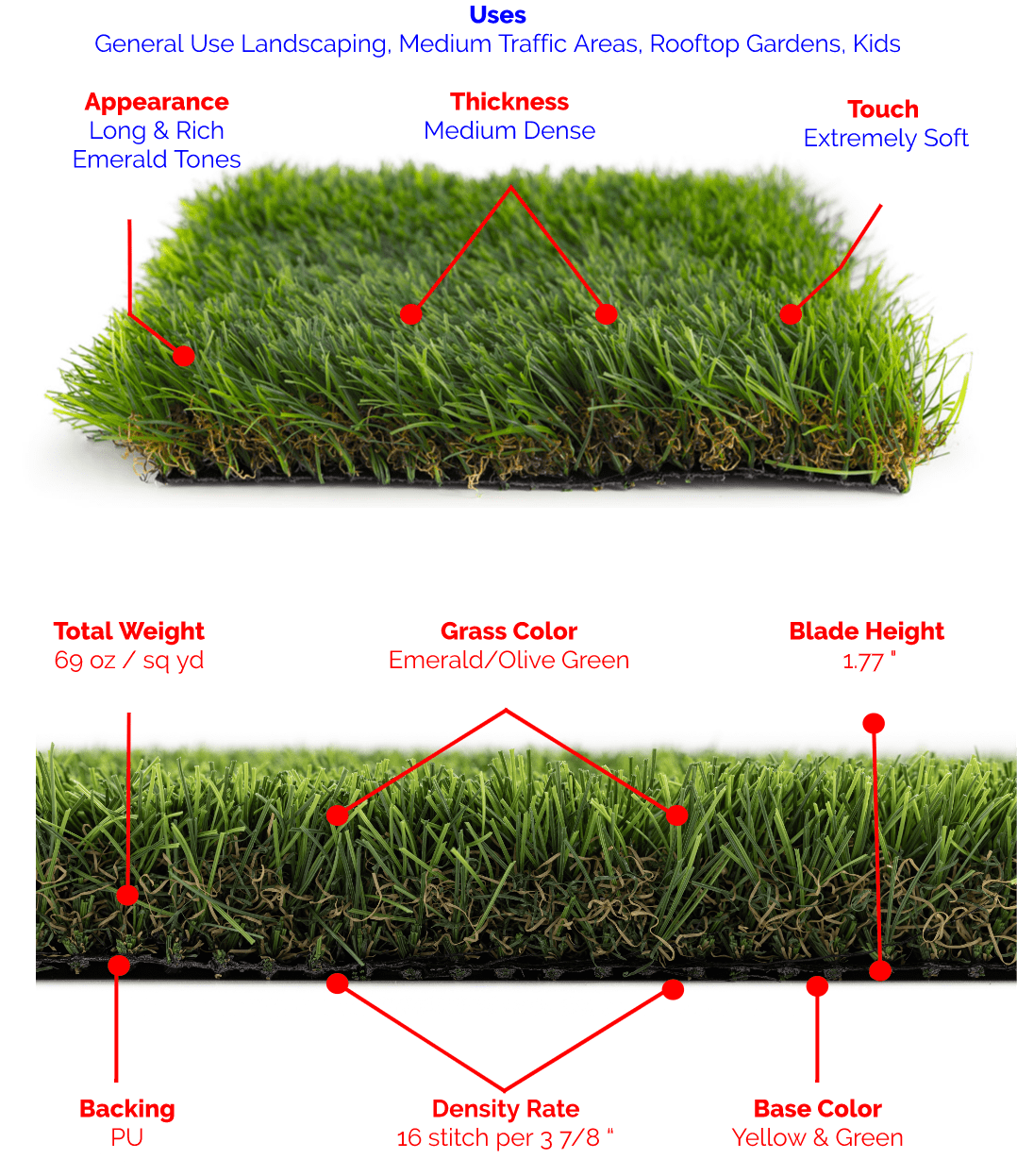 Backed by a durable polypropylene base and a tough polyurethane coating, Cedar is built to hold up in medium-traffic areas without matting or fading. It’s weather-resistant, water-efficient, and designed for homeowners who want beauty without the burden of constant upkeep.
